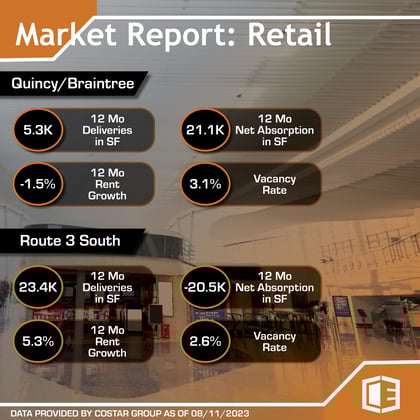 Vacancy in the Quincy/Braintree retail submarket is 3.1% and has decreased 0.2% over the past 12 months. During this period, 21,000 SF has been absorbed, and 5,300 SF has delivered. Total availability, which includes sublease space, is 4.0% of all inventory. Within this submarket, General Retail is the largest subtype, with 5.0 million SF in this category. Rents are around $32.00/SF, which is a 1.5% decrease from where they were a year ago. While rents have declined over the past 12 months, they are 3.6% higher than they were three years ago. There is nothing currently under construction. In the past 12 months, 24 sales have taken place. Sales have averaged $270/SF, and the estimated value for the submarket as a whole is $261/SF. Over the past three years, there have been 86 sales, which have traded for approximately $243 million. During this time, the market cap rate for Quincy/Braintree has edged down to 6.0%, marginally lower than its trailing three-year average of 6.1%.